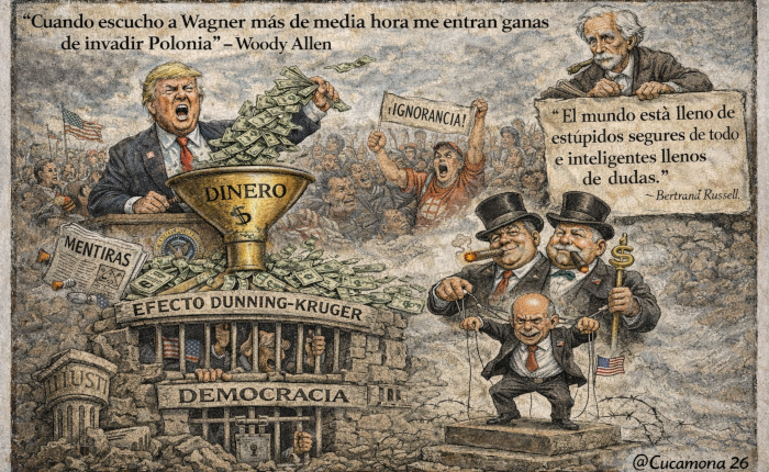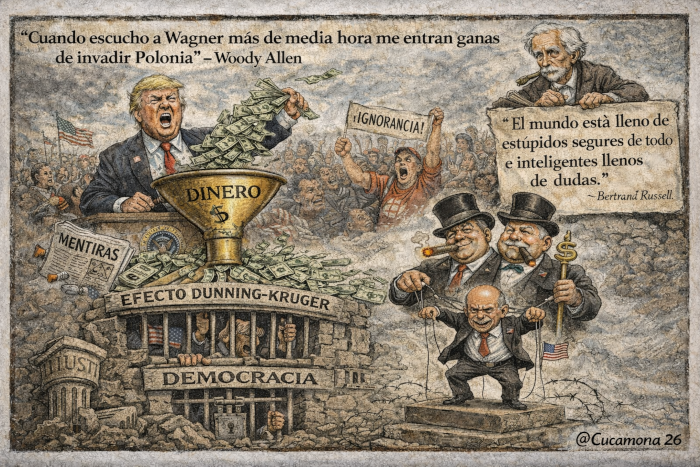 “Cuando escucho a Wagner más de media hora me entran ganas de invadir Polonia”, dice Woody Allen en la película Misterioso asesinato en Manhattan. Sin embargo, Wagner ya no es necesario, los impulsos emocionales tienen hoy unos artefactos íntimos más rudimentarios, ya que padecemos un tiempo en el que ser malintencionado, perverso, cruel e inmoral es loable como en otros tiempos oscuros pero en este caso sin Wagner. Ser ignorante en la actualidad puede dar buenos réditos en términos políticos. Para Donald Trump, por ejemplo, la ignorancia ha sido una ventaja. Muchos de sus partidarios se identifican con él por su falta de conocimiento y su poco pudor al respecto, sin importar que sea un líder político que atenta contra los derechos de cualquier comunidad que no sea la de los súper ricos norteamericanos. Es lo que se ha llamado en psicología el efecto Dunning-Kruger: personas que creen saber más de lo que en realidad saben. Cuanto menos conocen del tema más seguras parecen estar en sus declaraciones. Con la ignorancia en el poder, estamos condenados a repetir una y otra vez los mismos errores. Lamentablemente, como acertadamente señaló Bertrand Russell: “El problema con el mundo es que los estúpidos están seguros de todo y los inteligentes están llenos de dudas”.