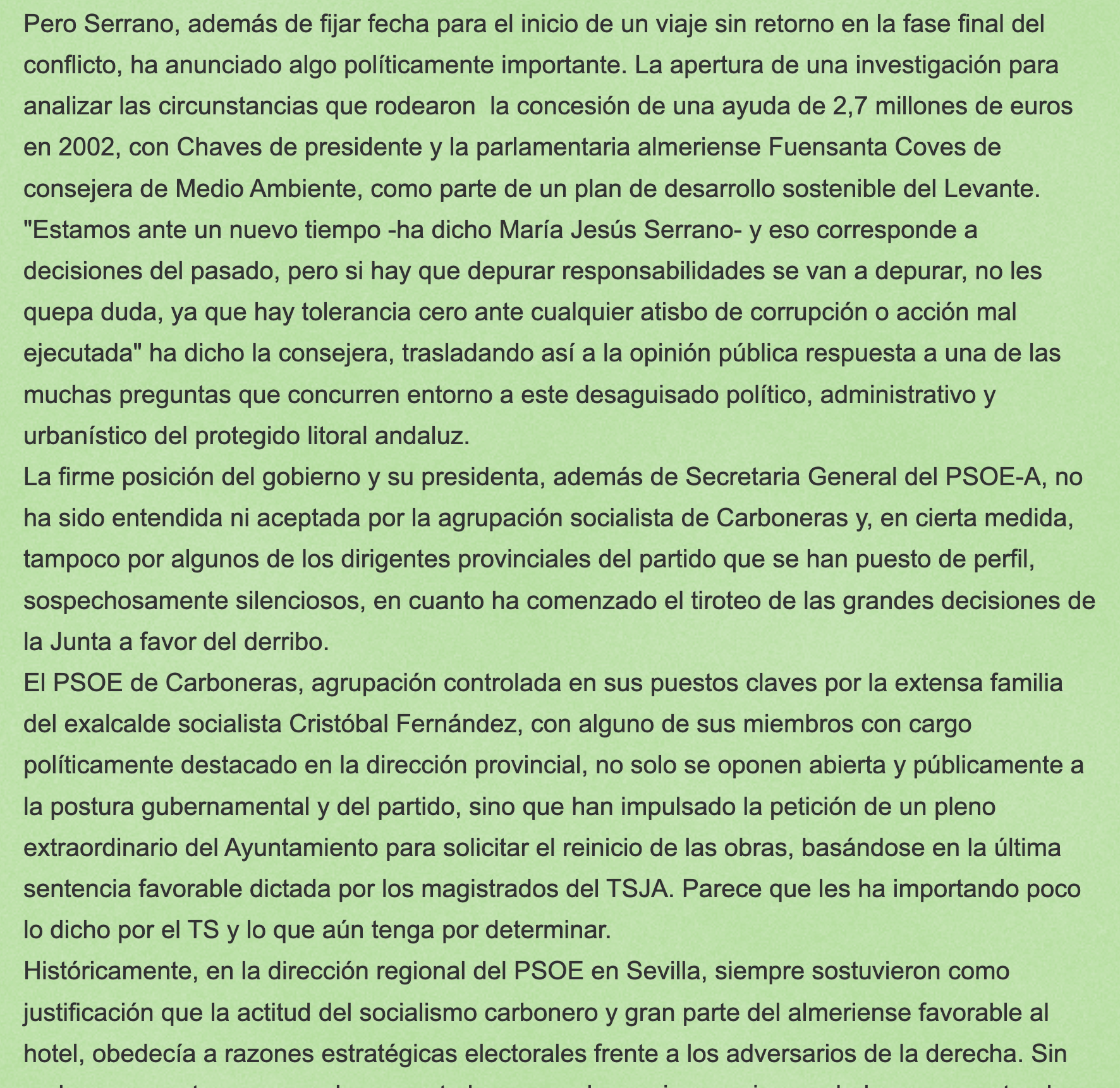 Ese episodio, gestado desde la agrupación de Carboneras con el alcalde Cristóbal Fernández como figura clave y bendecido desde Sevilla por pura aritmética interna, dejó una cicatriz política que el partido jamás logró cerrar. Ni siquiera el recorrido de figuras solventes como los alcaldes de Almería Santiago Martínez Cabrejas o Fernando Martínez fue suficiente para restablecer la credibilidad perdida, porque la mancha del Algarrobico se convirtió en un recordatorio permanente de cómo se gestionaba el poder cuando el territorio se subordinaba a intereses internos del partido o a dirigentes muy concretos y nada ejemplares por cierto, el alcalde Fernández tuvo que ser indultados por José Luis Rodríguez Zapatero para poder volverse a presentar y seguir en la política local.