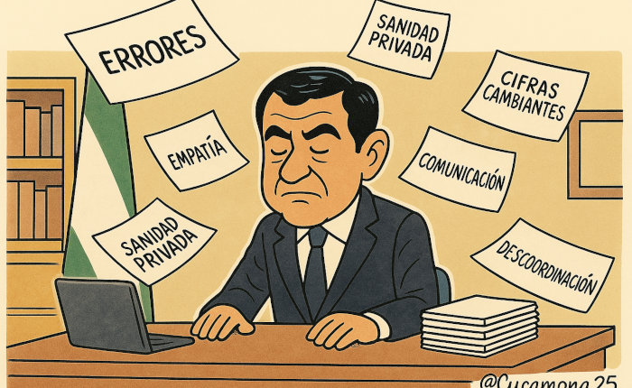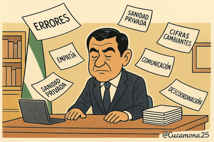 El tercer error fue político y público. En mitad de la tormenta, un senador del PP por Huelva, Carmelo Romero, lanzó la frase que ha quedado grabada como síntoma del desorden interno: “Quien tiene que dimitir son los médicos, no Juanma Moreno”. Mientras el presidente se esforzaba en defender a los profesionales del SAS y pedir a la oposición que no los “machacara”, un senador andaluz de su propio partido los señalaba. Todos como pollos sin cabeza. Romero reculó después, pidió perdón, pero el daño ya estaba hecho. Un error grave, porque rompió el mensaje oficial defensivo y reveló una gran descoordinación interna. Un desliz que además mostró que ni siquiera había un criterio unificado en el núcleo pata negra del partido.