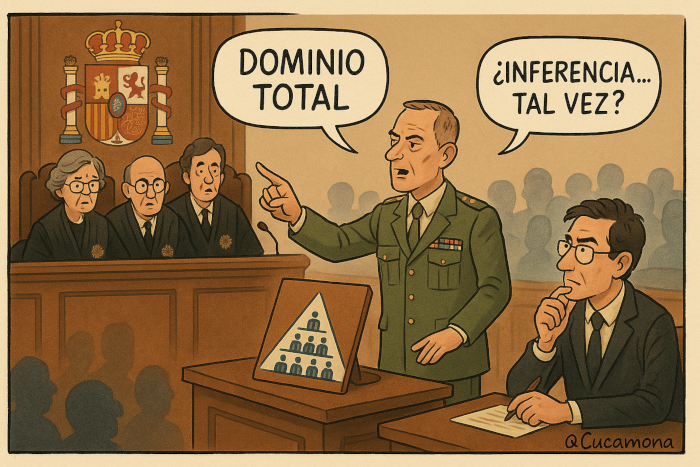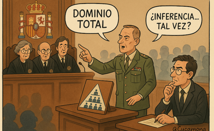 Me han venido a las mientes estas viejas anécdotas al contemplar, con cierta retranca he de reconocerlo, a un teniente coronel de la Guardia civil, de paisano, declarando ante las excelentísimas señorías de la sala segunda del Tribunal Supremo. Este funcionario militar, en funciones de policía judicial, por tanto, civil a las órdenes de un magistrado civil del propio y más constitucional de los órganos de justicia de la nación, insistía una y otra vez en que el acusado tenía dominio único y exclusivo sobre los actos que le habían llevado a presencia como acusado de tal alta y erudita sala de justicia. Y era culpable. ¿Una inferencia, sugiriole,el abogado defensor? De eso nada, dominio, todo el dominio, vino a decir no ad pedem literae. Como en el chamelo: tengas a o no tengas más, la salida taparás.