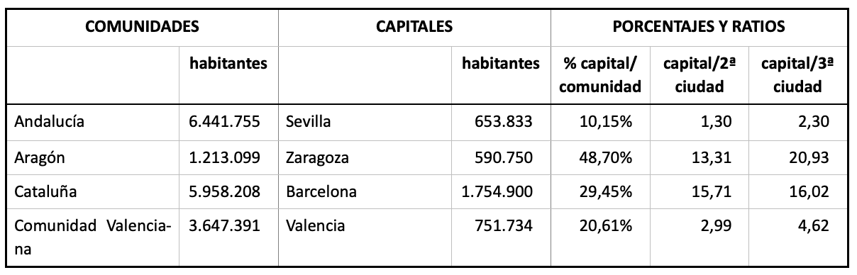 En las cuatro comunidades restantes, Andalucía, Aragón, Cataluña y Comunidad Valenciana, la capitalidad recayó en la ciudad más populosa de cada una de ellas: Sevilla, Zaragoza, Barcelona y Valencia respectivamente. Vamos ahora a analizar el peso relativo que, en términos demográficos, tenían dichas ciudades con relación al conjunto de la comunidad y respecto a los dos municipios de su misma comunidad que las seguían en número de habitantes, sin incluir los ubicados en la misma provincia de la capital: